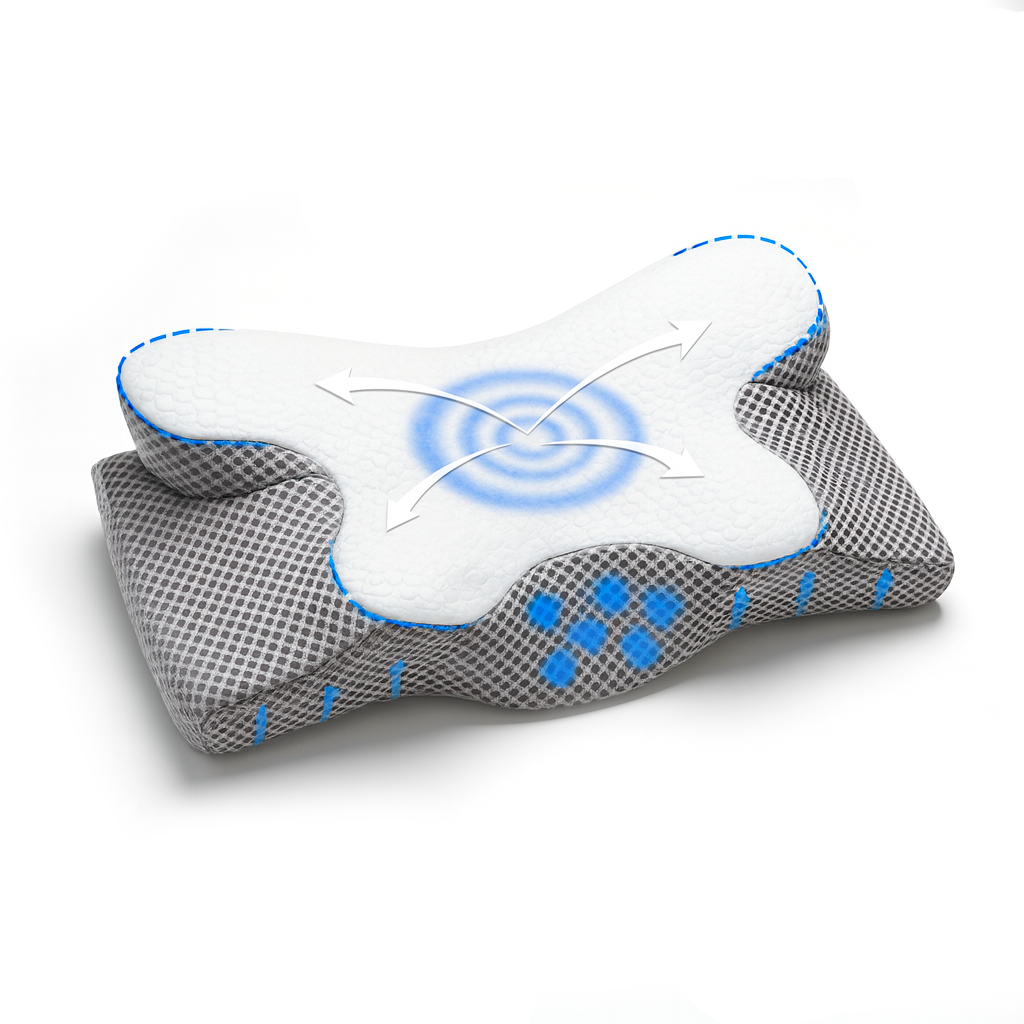 Prohlubeň uprostřed udrží hlavu stabilně, krk v přirozené ose a uvolní napětí v šíji. Paměťová pěna rovnoměrně rozloží tlak, takže dýchání je volné a ráno bez ztuhlosti.
